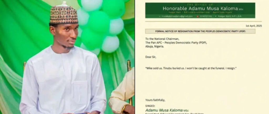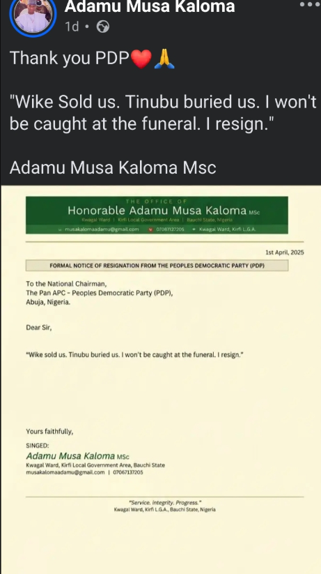 A chieftain of the Peoples Democratic Party (PDP) in Bauchi State, Hon. Adamu Musa Kaloma, has sparked widespread attention online after publicly announcing his resignation from the party.