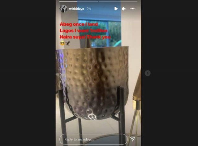 According to the Made in Lagos star, he would be needing N1 million worth of suya once he lands in the city. In his words: “Abeg once I land Lagos, I want 1 million naira suya. Thank you.”