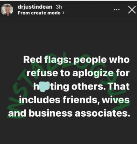 In a fresh update on his Instagram story, the father of two claims it is a red flag when a person refuses to apologize after hurting others and that includes wives, business associates and friends.