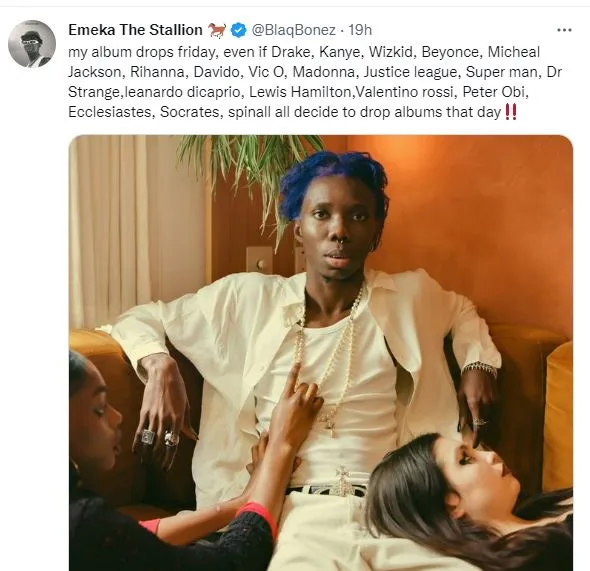 He tweeted; “My album drops friday, even if Drake, Kanye, Wizkid, Beyonce, Micheal Jackson, Rihanna, Davido, Vic O, Madonna, Justice league, Super man, Dr Strange,leanardo dicaprio, Lewis Hamilton,Valentino rossi, Peter Obi, Ecclesiastes, Socrates, spinall all decide to drop albums that day‼️”