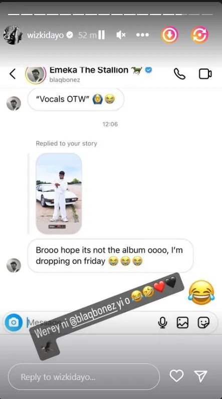 Seeing2 Wizkid’s update, Blaqbonez expressed sadness over this, then wrote; “Brooo, hope its not the album oooo, I’m dropping on Friday.” then added crying emojis.