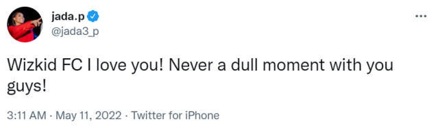 “Wizkid FC I love you! Never a dull moment with you guys!” she tweeted.