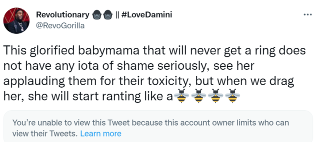 “This glorified babymama that will never get a ring does not have any iota of shame seriously, see her applauding them for their toxicity, but when we drag her, she will start ranting like a”, the troll tweeted.