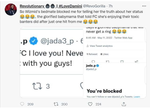 “So Wizkid’s bedmate blocked me for telling her the truth about her status , the glorified babymama that told FC she’s enjoying their toxic banters did after just one hit from me ” he wrote.