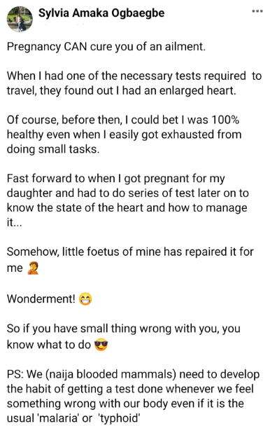 Sylvia Amaka Ogbaegbe stated, “Pregnancy can cure you of an ailment.