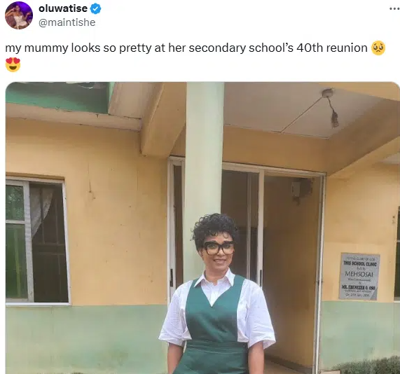 Her daughter, @maintishe, shared the images on the social media platform X. It has been reported that the woman, a mother of four, is an alumna of Methodist High School Arigbajo in Ogun State.