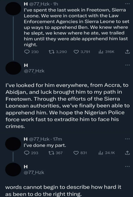 I’ve looked for him everywhere, from Accra, to Abidjan, and luck brought him to my path in Freetown. Through the efforts of the Sierra Leonean authorities, we’ve finally been able to apprehend him. We hope the Nigerian Police force work fast to extradite him to face his crimes.“