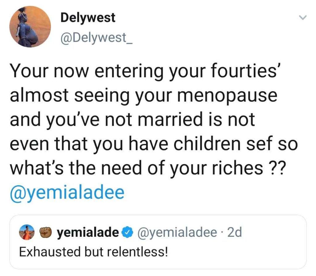 “You are now entering your forties, almost seeing your menopause and you’ve never married, not even that you have children, so what’s the need for your riches?” the troll wrote in response to her tweet.