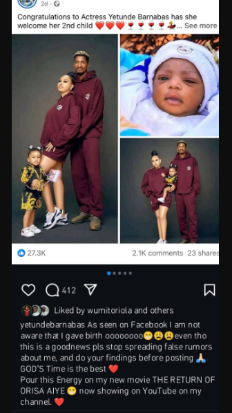 Nollywood actress Yetunde Barnabas has set the record straight, addressing false rumours about her welcoming a second child with her footballer husband, Olayinka Peters. In an Instagram post, she shared a screenshot of a Facebook post that falsely claimed she had given birth to her second child. While she acknowledged that the news was positive, Yetunde urged people to stop spreading unfounded rumours and to verify information before sharing it.