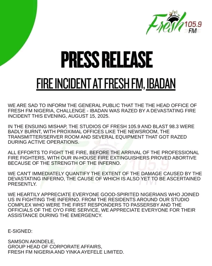 “We are sad to inform the general public that the the head office of Fresh FMNigeria, challenge ibadan was razed by a devastating fire incident this evening, August 15, 2025.