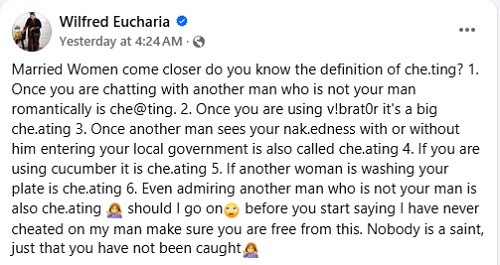“Married Women come closer do you know the definition of cheating? 1. Once you are chatting with another man who is not your man romantically is che@ting. 2. Once you are using v!brat0r it’s a big che.ating 3. Once another man sees your nak.edness with or without him entering your local government is also called che.ating 4. If you are using cucumber it is che.ating 5. If another woman is washing your plate is che.ating 6. Even admiring another man who is not your man is also che.ating. Should I go on before you start saying I have never cheated on my man make sure you are free from this. Nobody is a saint, just that you have not been caught,” she wrote in a Facebook post on Tuesday.