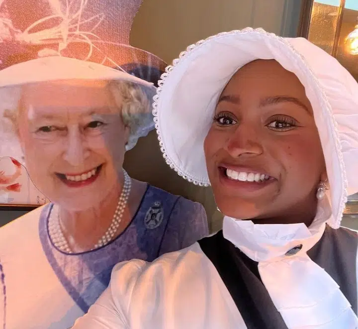 Nigerian disc jockey, Florence Otedola better known as DJ Cuppy has caused a stir online with her dressing to the Queen of England’s Platinum Jubilee party.