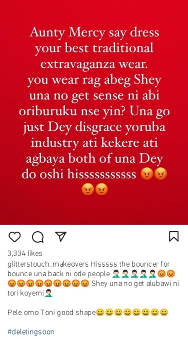 “Aunty Mercy say dress your best traditional extravaganza wear. You wear rag abeg Shey una no get sense ni Abu oriburuku nse yin? Una go just dey disgrace Yoruba industry ATI kekere ATI Agbaya both of una dey do oshi hisssss.