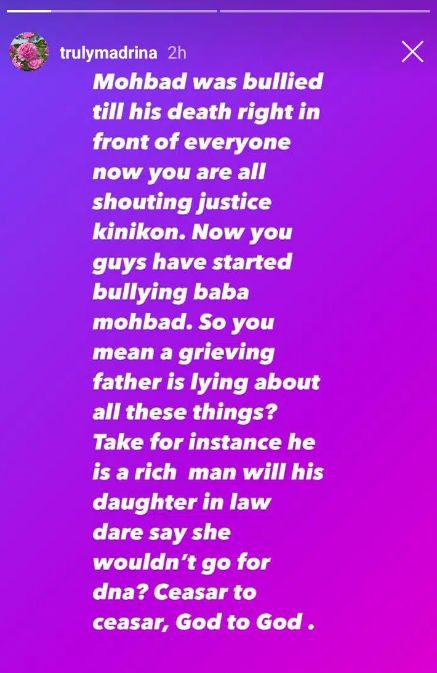 “Mohbad was bu.lied till his dea.th right in front of everyone now you are all shouting justice kinikon. Now you guys have started bullying baba mohbad. So you mean a grieving father is lying about all these things? Take for instance he is a rich man will his daughter in law dare say she wouldn’t go for dna? Ceasar to ceasar, God to God .