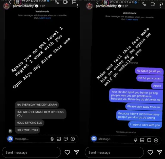 “Aparo you no get level, I regret I work with you. Ogun aiye dey follow this one,” Portable captioned the post.
