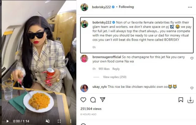 In his word: Non of ur favorite female celebrities fly with their glam team and workers, we don’t share space on pj. we pay for full jet. I will always top the chart always…
