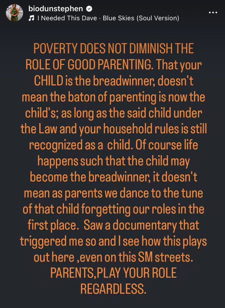 In a post shared on Instagram, Biodun acknowledged that while it is true that circumstances may lead a child to support the family financially, this should not result in parents relinquishing their role and responsibilities as guardians.