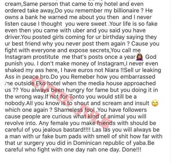 I don’t make money of Instagram, I never even shaked my ass here, I have euros not Naira!! Sell your leaking ass in peace bro. Do you remember how you embarrassed me outside Eko Hotel when the media house approached us?? You always been hungry for fame but you doing it in the wrong way. If not for Tonto, you would till be nobody.