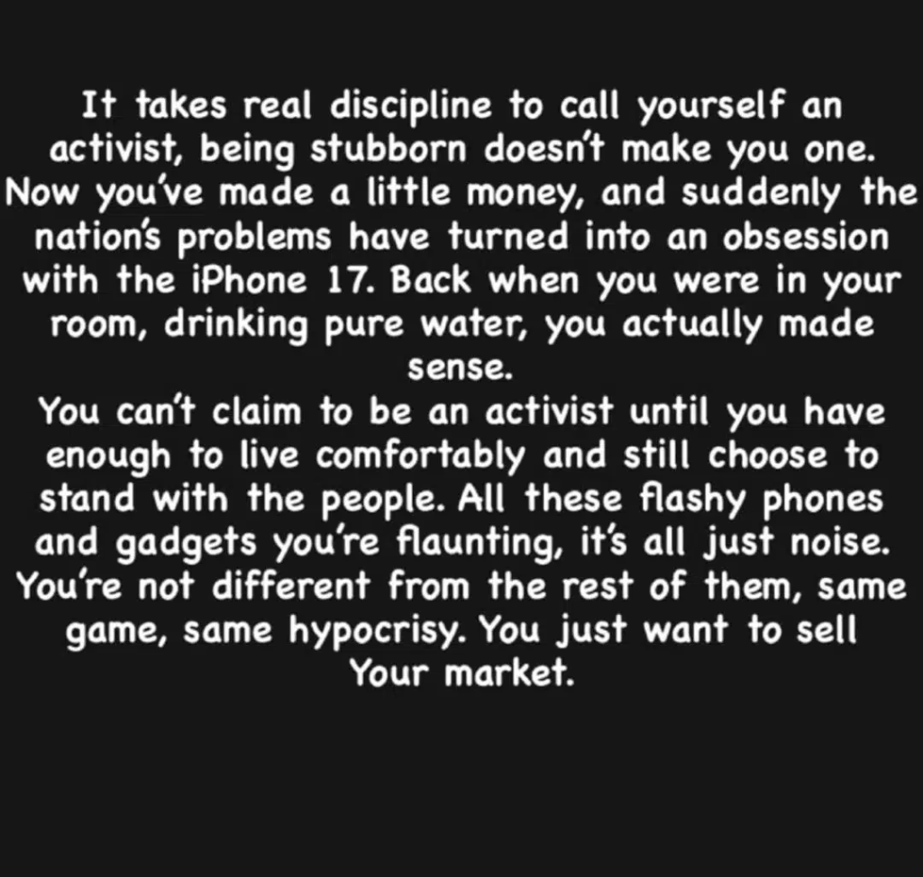 “Being stubborn doesn’t make you an activist. Real activism requires discipline. Now that you’ve made some money, suddenly the country’s problems have turned into an iPhone 17 obsession. Back when you were in your room drinking pure water, you actually made sense.”
