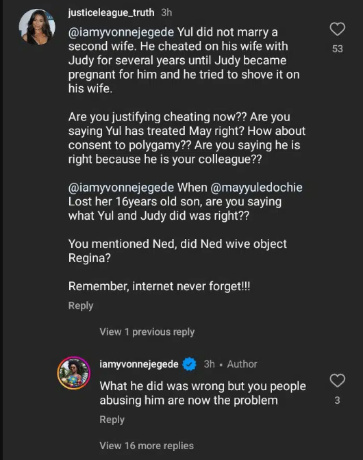 Actress Yvonne Jegede has responded to the backlash she received for supporting Yul Edochie’s marriage to Judy Austin.