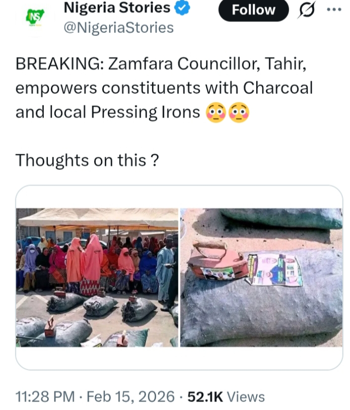 - A councillor in Gusau, Zamfara State, reportedly distributed charcoal and pressing irons to constituents as empowerment gifts.